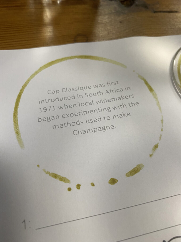 Voor jou op die tafels wag daar wat lyk na ’n plekmatjie. Daar staan vier glase, ’n potlood vir aantekeninge maak en ’n spoegbakkie vir dié wat nie so dors is nie. Aan ons tafel was niemand nie, want wie spog nou borrels uit?