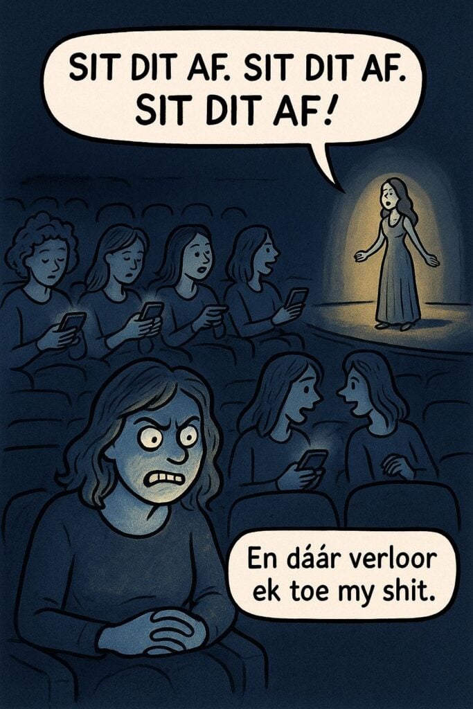 Dis die selfone, sien. Hóéveel jaar al word gesmeek. Sit dit af. Sit dit op silent. Sit dit in jou sak en zip dit toe. Los dit in die kar. As daar dan nou werklik ’n krisis is, “gaan kamerverlaat”: Vat jou foon, stap so saggies uit as wat jy kan en gaan kommunikeer wat skynbaar op daardie presiese oomblik gekommunikeer moet word. Moenie die ervaring vir die res van ons in die donker teater bederf nie, maar meer nog: Moenie dit vir die kunstenaars op die verhoog onsmaaklik maak nie.