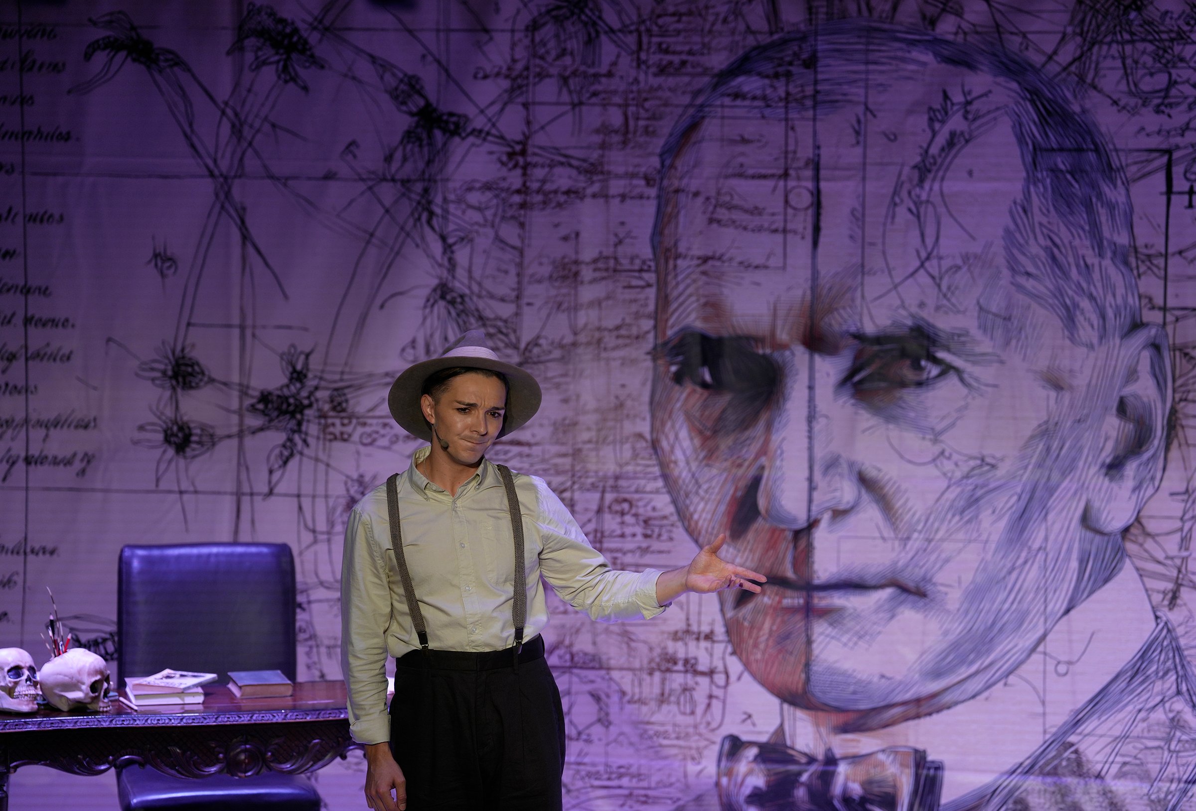 Moenie Wilhelm Disbergen se bydrae met die stel agterweë laat nie, veral die agtergronddoek met sy reuse-uitbeelding van Eugène Marais se gesig, sy blik stip en intens. Dis een van daardie afbeeldings waar die persoon se oë jou volg waar ookal jy jou in die vertrek bevind. Verder is dit vol sekondêre grafika-elemente soos miere en geskrifte, dinge wat Marais se lewe gekenmerk het. Barry Strydom se beligting dra ook soomloos by tot die atmosfeer van die kabaret. Inderdaad ’n spanpoging van Wêla Kapêla Produksies, al die pad van Oos-Londen.