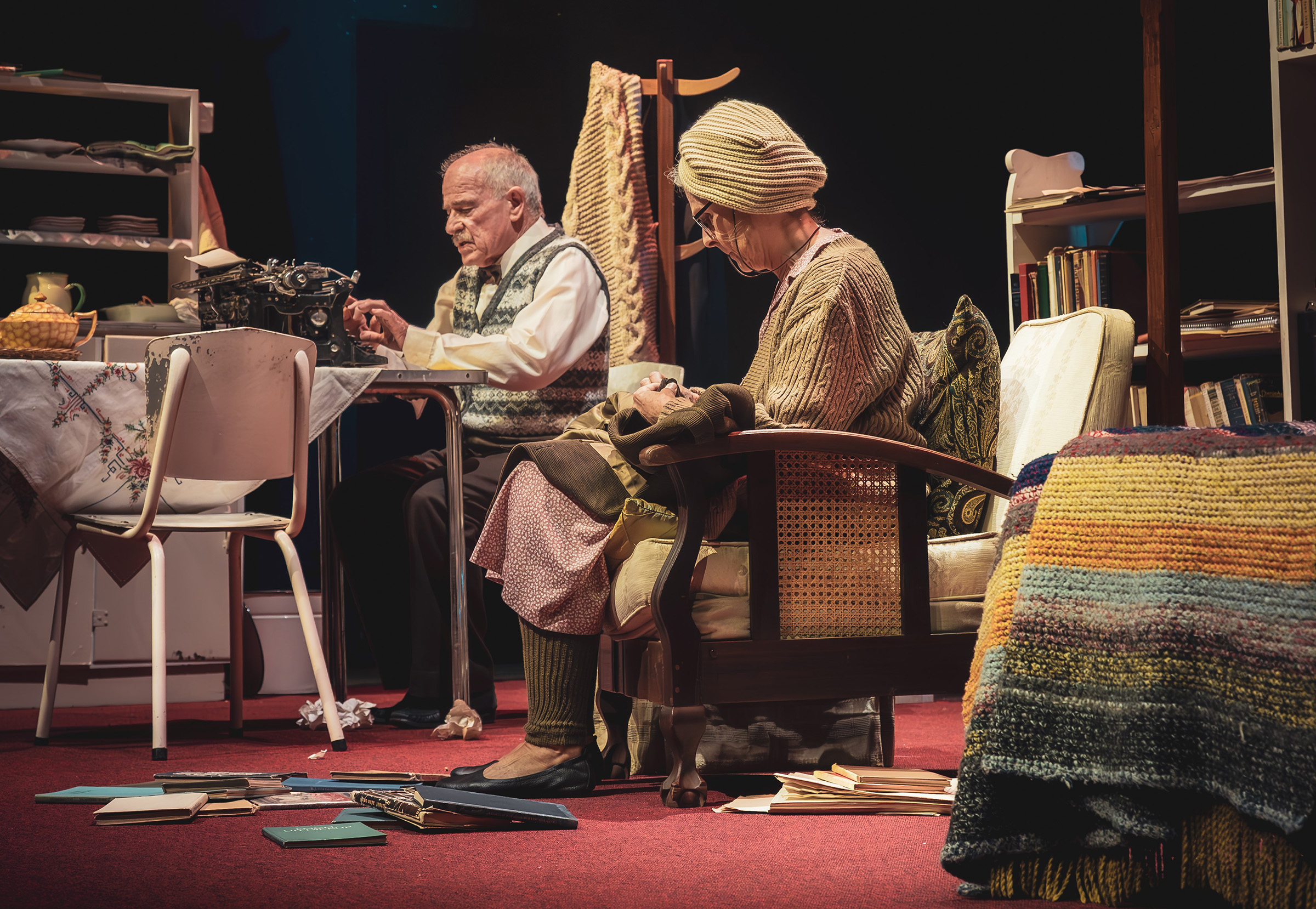 Francois Toerien se teks is heavy. It hoort soe. Die dialoog het stukkies van Blum se gedigte en real-life briewe. Juanita Swanepoel regisseer met restraint en hou die ritme tussen spoekverhaal en psigologiese portret. Tyd issie liniêr nie, jare vloei in mekaa, die beligting help ôs byhou, is warm wanne liefde onthou, koud wanne spyt ooneem.