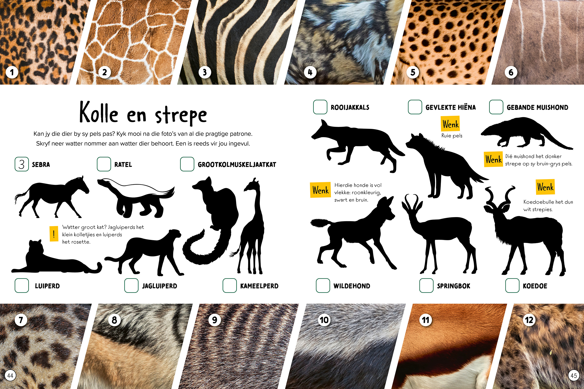 ’n Prettige werksessie oor Afrika se wilde diere waar elkeen van die jongelinge ’n mini-aktiwiteitsboek met plakkers, doolhowe, soek-die-verskille- en pas-bymekaar-speletjies kry. Kom vind uit hoekom vlermuis-mammas so fiks is, watter apies die slimste is en hoekom jy nie met ’n seekoei mors nie. Dit word op 11 Oktober om 10:00 by die Hofmeyrsaal aangebied deur Heléne Booyens. Toegang is gratis, maar dit is noodsaaklik om te bespreek by program@woordfees.co.za.