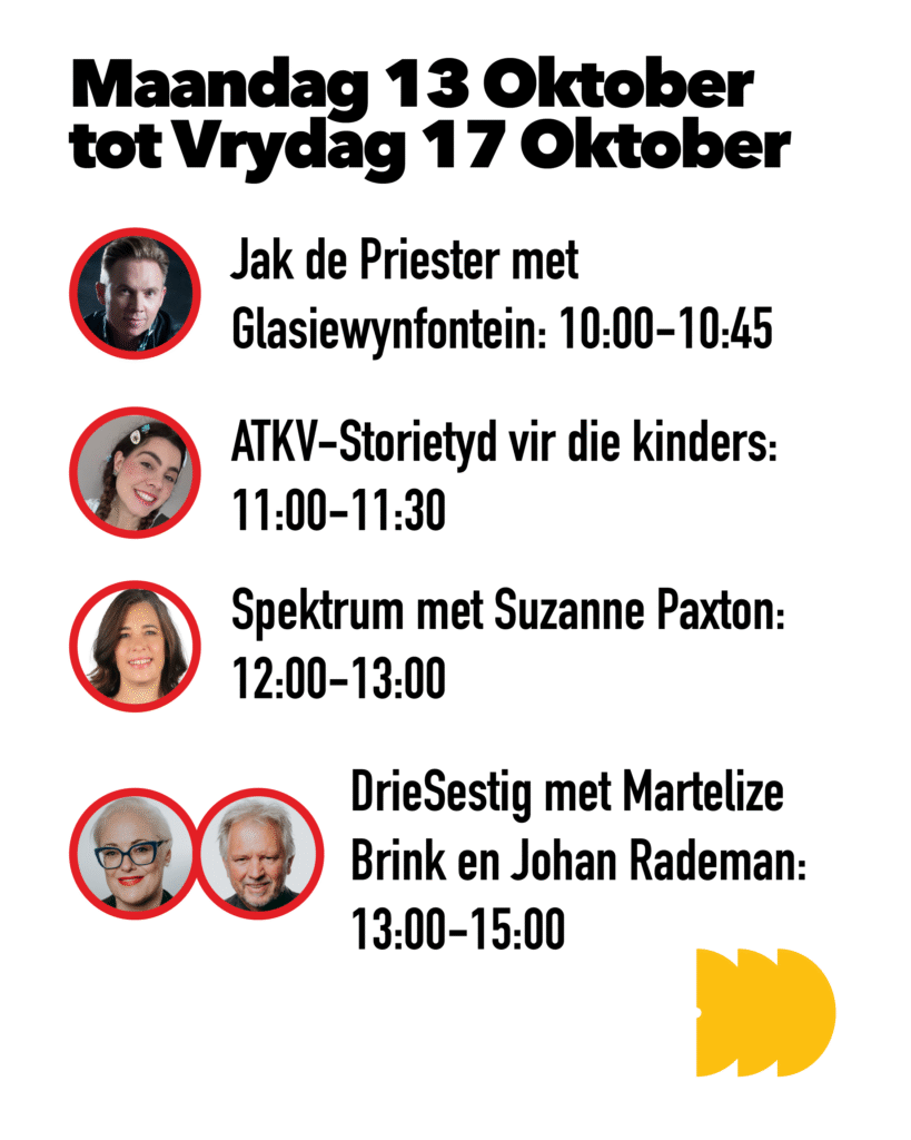 Die RSG/ATKV-vierkant is ’n hoogtepunt by die 2025 Toyota Stellenbosch Woordfees. Dis ’n gesellige kuierplek by die US Museum waar stories, musiek en mense saamkom. Van 13 tot 19 Oktober is dit elke oggend (11:00 tot 11:30) storietyd vir jong lesers met Lalla Lees, terwyl Jak de Priester daagliks optree en sy geselsprogram aanbied. RSG saai regstreeks vanaf die vierkant uit met gewilde programme soos Spektrum, Kommentaar en Saterdag Sprankel. Kom luister, kuier en ontmoet bekende RSG-stemme soos Martelize Brink, Johan Rademan en Suzanne Paxton.