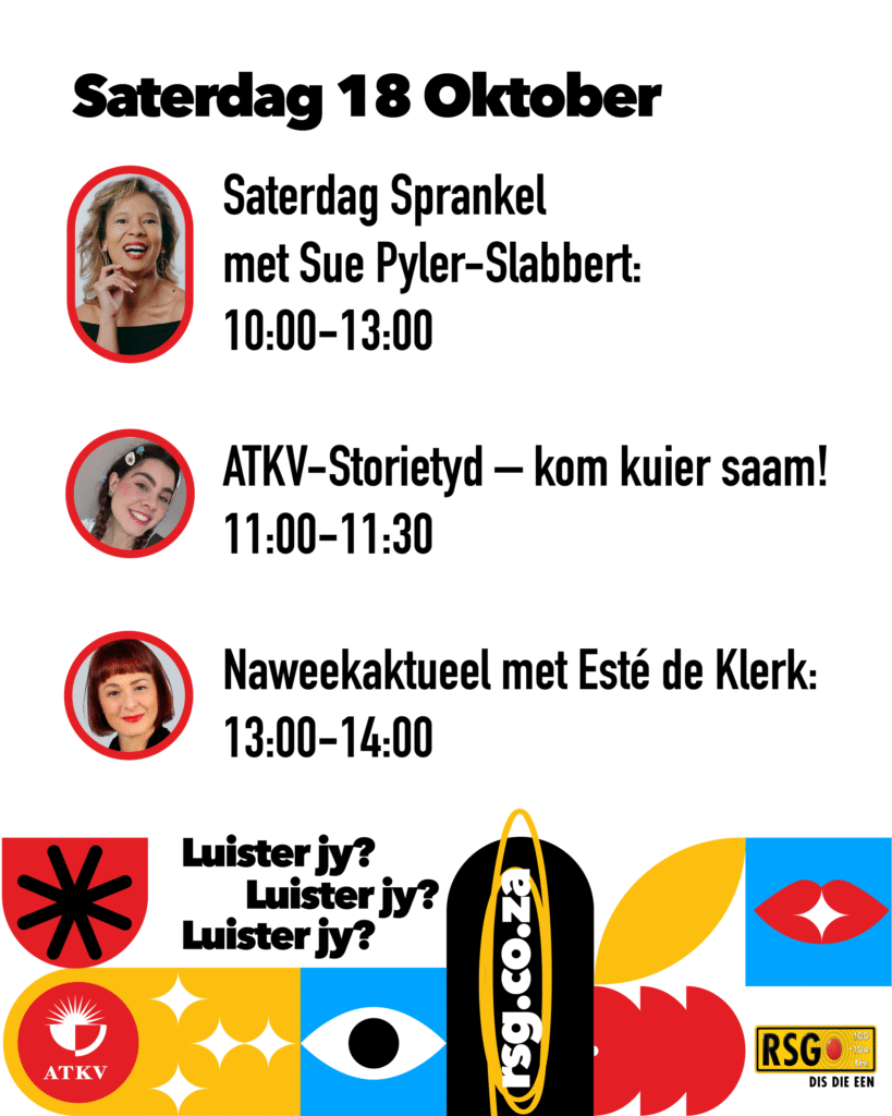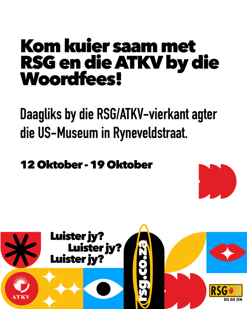 Die RSG/ATKV-vierkant is ’n hoogtepunt by die 2025 Toyota Stellenbosch Woordfees. Dis ’n gesellige kuierplek by die US Museum waar stories, musiek en mense saamkom. Van 13 tot 19 Oktober is dit elke oggend (11:00 tot 11:30) storietyd vir jong lesers met Lalla Lees, terwyl Jak de Priester daagliks optree en sy geselsprogram aanbied. RSG saai regstreeks vanaf die vierkant uit met gewilde programme soos Spektrum, Kommentaar en Saterdag Sprankel. Kom luister, kuier en ontmoet bekende RSG-stemme soos Martelize Brink, Johan Rademan en Suzanne Paxton.